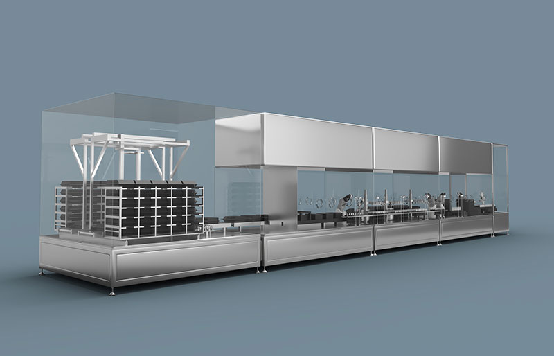 血培养二代无菌PET瓶上料、无菌自动拆包,自动输送到灌装处、自动搅拌灌装、半压塞、抽真空,充氮气,压塞、压盖,贴标